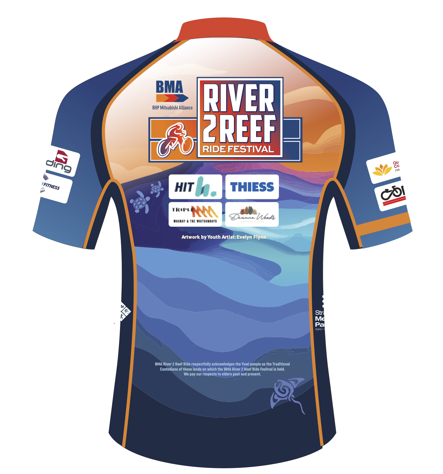 Inspired by the relationship between Mackay rivers and the reef, Evie’s design reflects the natural flow of water. Like the current, our cyclists push forward through resistance, becoming part of the natural flow that links our freshwaters to our oceans.